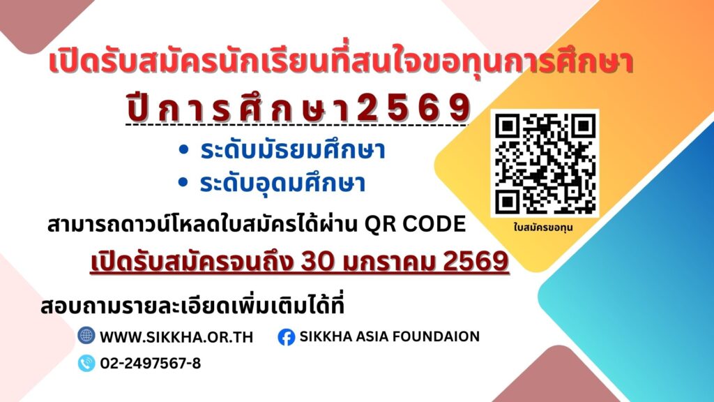 มูลนิธิสิกขาเอเซีย เปิดรับสมัครนักเรียนที่สนใจขอทุนการศึกษา ปีการศึกษา 2569 โดยกำลังจะสำเร็จการศึกษาในระดับชั้นประถมศึกษาปีที่ 6 และระดับมัธยมศึกษา ตอนต้นและตอนปลาย ที่สนใจขอรับทุนการศึกษา โดยคุณสมบัต