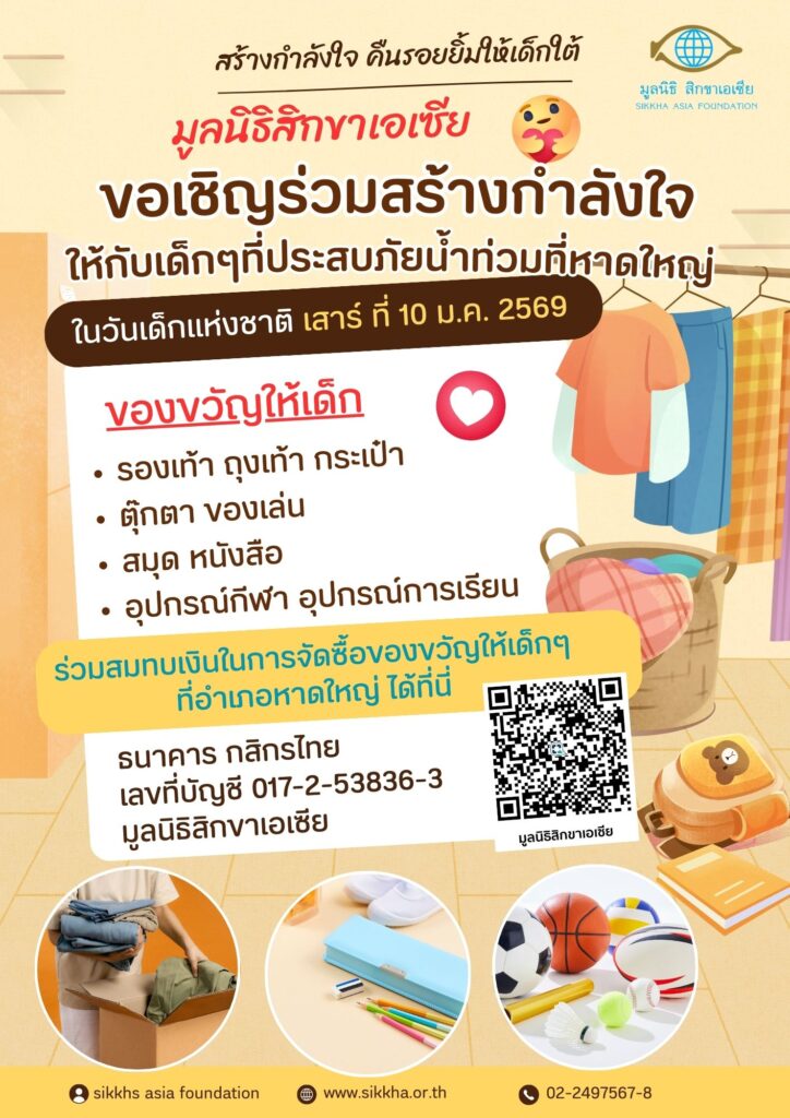 มูลนิธิสิกขาเอเซีย ขอเชิญชวนร่วมส่งคืนรอยยิ้ม และสร้างกำลังใจให้กับเด็กๆ ที่ประสบอุทกภัยน้ำท่วม อำเภอหาดใหญ่ จังหวัดสงขลา ในช่วงปลายเดือนพฤศจิกายน ที่ผ่านมา ด้วยการร่วมสมทบเงินในการจัดซื้อของขวัญหรืออ
